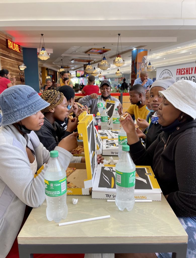 Zurück von der Wanderung gehen wir noch zusammen Pizza essen. Im Anschluss werden die Myoli-Mitglieder wieder mit dem Minibus zurück ins Township gebracht.