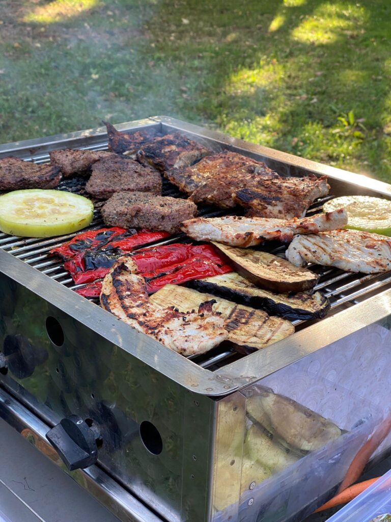 Danach wurden noch letzte Fragen beantwortet, bevor mit dem Abendessen begonnen wurde. Auf 2 Grills wurden Rindersteaks, Putensteaks, Spareribs, Paprika, Auberginen, Zucchini und als typisch südafrikanische Grillspezialität Braaibroodjies (Grillbrote) gegrillt. Es gab 4 verschiedene Salate und Baguette. Dazu wurde südafrikanischer Wein, Bier (mit und ohne Alkohol) sowie Softdrinks gereicht.