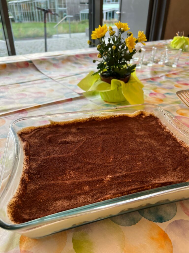 Auch für den Nachtisch war gesorgt. Es gab selbstgemachtes Tiramisu und selbstgemachten südafrikanischen Melktert (Milchkuchen). Obwohl es allen sehr gut schmeckte und jeder tüchtig zugriff, blieb noch einiges übrig, worüber sich einige Jugendliche, die sich vor dem Jugendhaus eingefundene hatten, sehr freuten. Sie durften beim Rest essen mithelfen, so dass nichts weggeworfen werden musste.