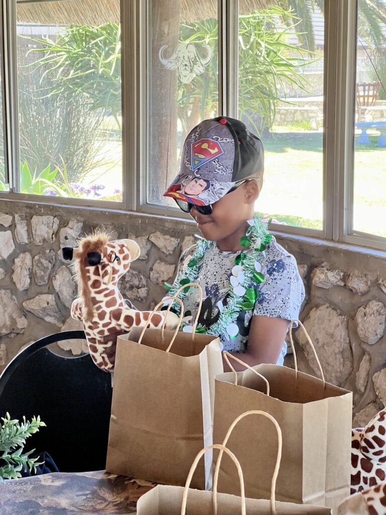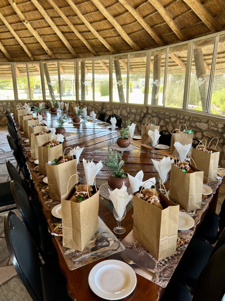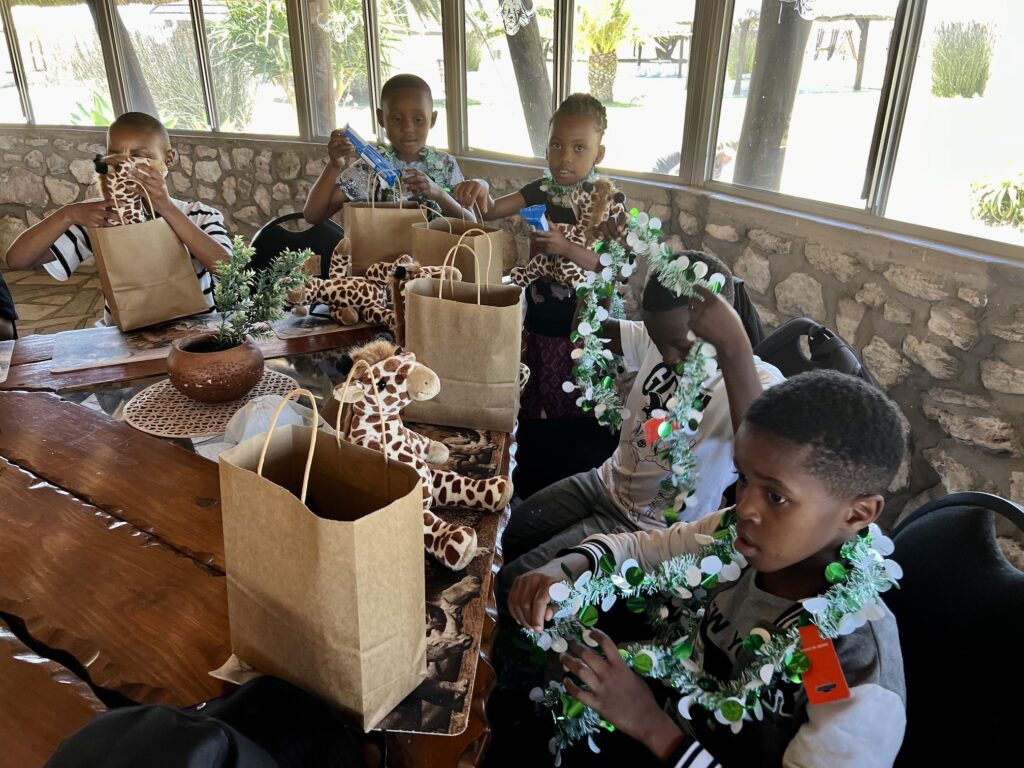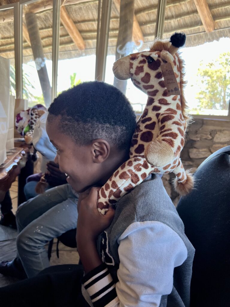 Buffelsfontein hat uns eine schöne Tafel hergerichtet und die Stipendiaten haben von Myoli ein Weihnachtsgeschenk erhalten. Passend zum Anlass gab es Plüschgiraffen von Born Wild Gift, die in Kapstadt hergestellt werden.