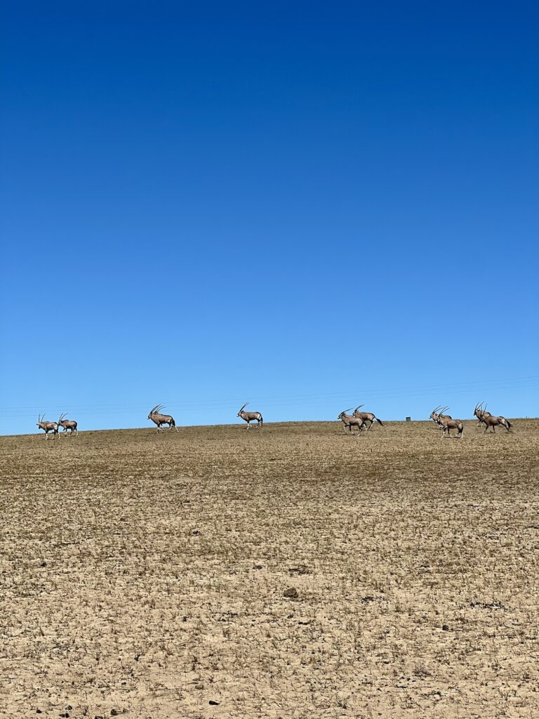 Außerdem haben wir Springböcke, Oryxantilopen, Gnus, Zebras und Giraffen entdeckt.